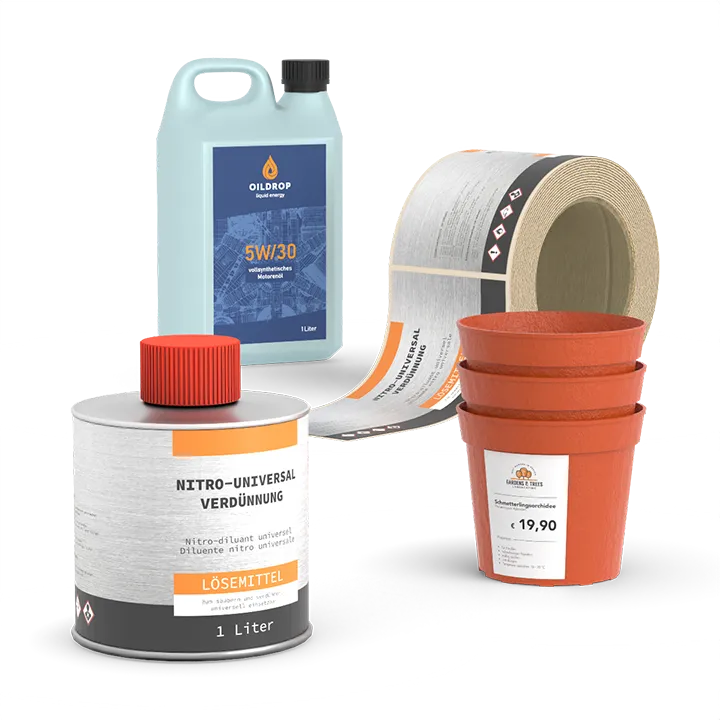 Etiketten von Labelprint24 werden in nahezu jeder Branche eingesetzt – unter anderem als Label für Logistik, Versand, Lebensmittel, Getränke, Arzneimittel, Körperpflegeprodukte oder Gebrauchsgüter. Die Industriezweige können dabei unterschiedlich sein: Die Spanne reicht von der Chemie-, Lebensmittel-, Getränke- bis hin zur Kosmetikindustrie. Dabei müssen Etiketten aus Papier oder Folie je nach Verwendungszweck kurz- oder langlebig, lebensmittelgeeignet, wasser- und kratzfest, UV-beständig oder chemikalienresistent sein.