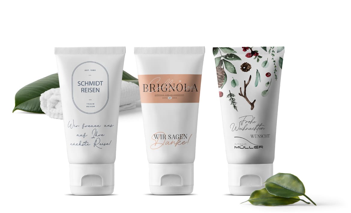 Sie suchen ein individuell bedrucktes und befülltes Werbepräsent? Eine pflegende Handcreme, ein erfrischendes Duschgel und ein schützendes Handreinigungsgel für Ihre Kunden? Entdecken Sie die Werbeartikel Tuben von Labelprint24.com!
