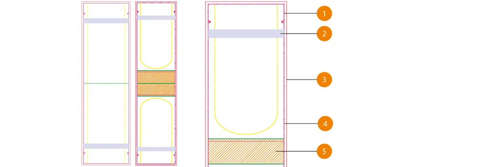 Für den Beutelboden eines Doypacks sollten Verzerrungen beim Befüllen berücksichtigt werden. Wichtige Elemente wie Logos oder Texte dürfen nicht nahe an Faltkanten oder Schweißnähte platziert werden. Gleichmäßige Designs und Sicherheitsabstände gewährleisten eine optimale Darstellung.