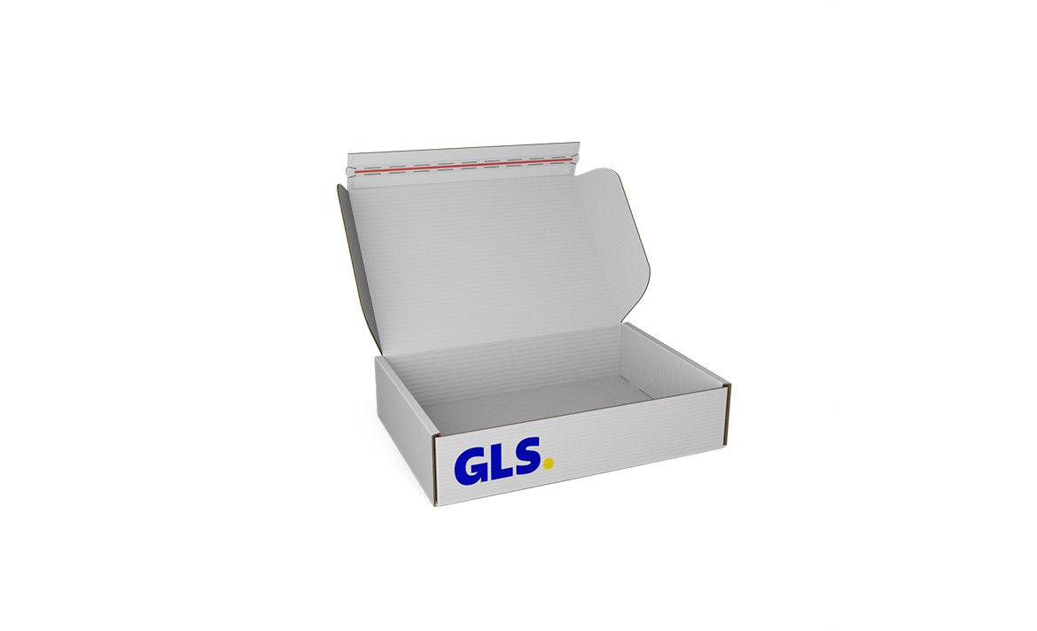 GLS Karton mit Klebestreifen und Aufreißlasche von Labelprint24 – praxisgerechte Klappdeckelkartons aus Wellpappe für den GLS-Paketversand, per Druck personalisierbar oder auch unbedruckt erhältlich.