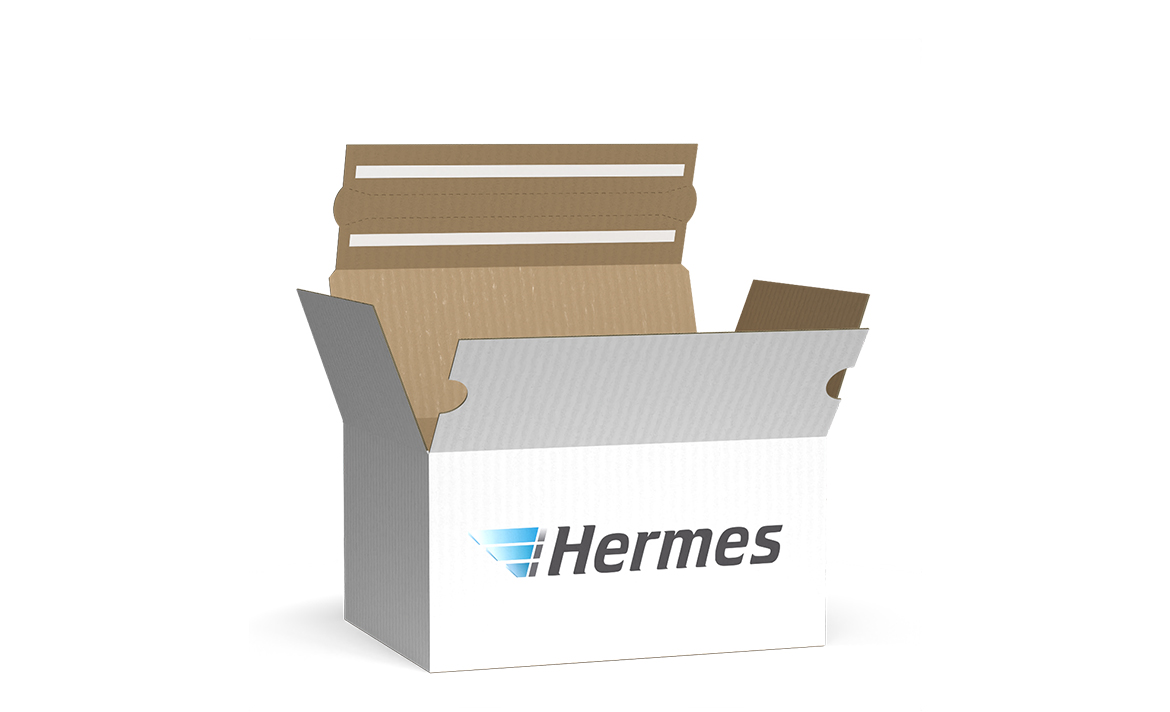 Hermes Paket von Labelprint24 – Versandkarton aus formstabiler Wellpappe mit Automatikboden und zwei Klebestreifen in Standardmaßen. Aufreißstreifen für schnelles Öffnen, selbstverriegelnder Boden – bedruckt oder unbedruckt erhältlich.
