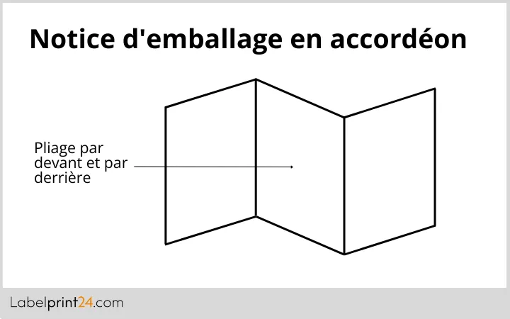 Le pliage en accordéon, également appelé pliage zigzag, est reconnaissable extérieurement à sa forme en Z. Il s'agit d'une forme simple de pliage parallèle. Sa forme est obtenue en pliant deux ou plusieurs pages de l'encart en alternance dans des directions différentes. La forme typique en zigzag ressemble au soufflet d'un accordéon ou d'un éventail. Après le pliage, toutes les pages de la notice ont la même taille.