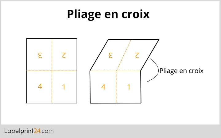 Le pliage croisé, également connu sous le nom de pliage en croix, est utile pour ramener les formats ouverts de la notice d'emballage ou du mode d'emploi à un format plus petit. Les raisons peuvent être un transport plus facile du produit, une plus grande flexibilité lors de l'envoi postal ou une taille maximale pour les encarts dans un emballage. Une variante fréquemment utilisée est le pliage croisé à deux plis, qui consiste à plier horizontalement et verticalement pour obtenir 8 pages. Le pliage croisé est souvent utilisé en combinaison avec d'autres types de pliage :