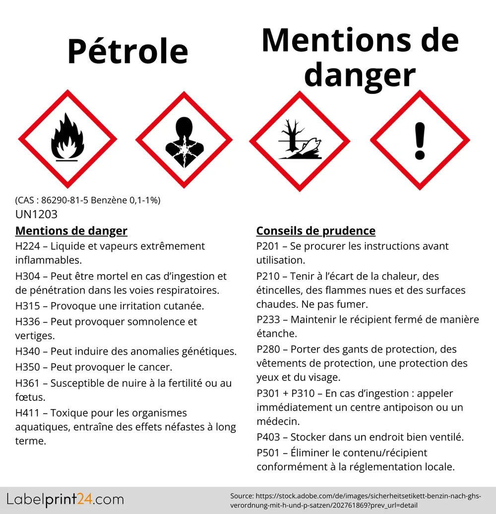- Un code H (Hazard Statement), qui commence par "H" suivi de 2 à 4 chiffres, détaillant le type exact de danger.