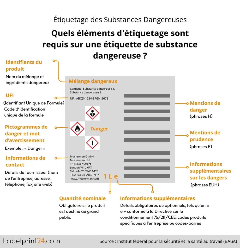 - Des informations de sécurité détaillées, incluant la composition du produit, les risques spécifiques, les mesures de précaution recommandées, ainsi que les coordonnées du fabricant ou distributeur.