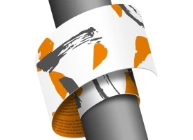 Les étiquettes enroulables avec impression au verso sont uniquement disponibles pour les récipients ronds, tels que les aérosols ou les bouteilles de solvant, les flacons, les bouteilles de peinture, de vernis, de lasure, etc. Les étiquettes d'emballage sont fixées sur les récipients ronds à l'aide d'une surface adhésive, puis sont enroulées autour du récipient.
