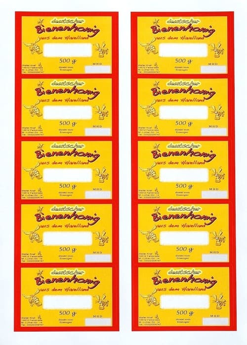 Le etichette adesive e gli sticker hanno quindi spesso un design efficace ed emozionale. Devono catturare immediatamente l'attenzione del destinatario e innescare un'azione, come nel caso di un'offerta speciale. Per noi, come produttori di etichette, è importante garantire una qualità di stampa di prima classe per le vostre etichette personalizzate. Questa promessa vale anche per le etichette adesive per l'ufficio, per il tempo libero e gli hobby o per le aziende artigianali come gli apicoltori, le distillerie e gli imbottigliatori.