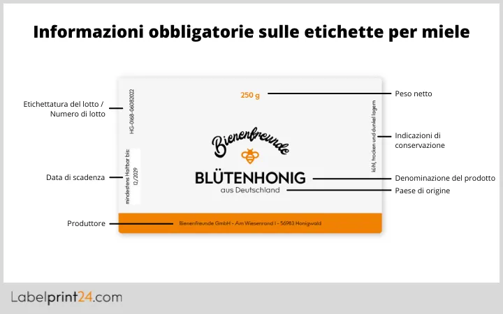 Le etichette per miele devono essere applicate sulle confezioni per fornire, ad esempio, informazioni ai consumatori circa l'origine, la composizione, la denominazione e la qualità del miele. Le etichette riportano anche informazioni obbligatorie come gli ingredienti o la data di scadenza. Per i vasetti di miele possono essere utilizzate anche etichette sigillo, in modo da poter garantire con certezza che il miele sia rimasto intatto prima dell'acquisto e che non sia stato aperto. Nella maggior parte dei casi, i richiami e i motivi pubblicitari vengono applicati sulla parte frontale del vasetto di miele, mentre sul retro vengono riportate le informazioni obbligatorie.